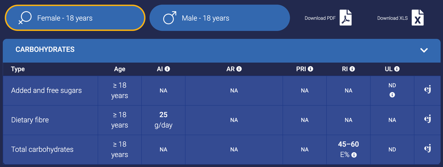 Las guías nutricionales internacionales (OMS, EFSA) recomiendan que entre el 45 y 65 % de las calorías diarias provengan de carbohidratos. Podéis ver en el siguiente link las recomendaciones de ingesta diaria según tus características: